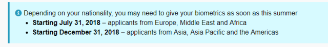 一直有消息称,加拿大要在今年对全球入境签证申请者增加生物采集(指纹和面部识别)这项程序,但对中国公民何时开始执行?时间一直没确定。